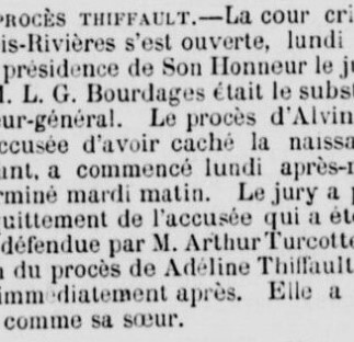 Le procès d’Alvina Thiffault s’est ouvert en octobre 1869 au palais de justice de Trois-Rivières. On l’accusait « d’avoir caché la naissance de son enfant », comme on le disait à l’époque. Le jury a choisi de l’acquitter. Sa sœur a également été acquittée.