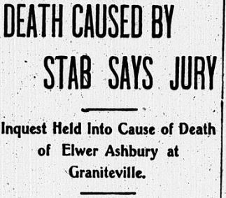 Le 24 octobre 1901, Elmer Astbury est décédé après avoir été poignardé à l’abdomen lors d’une bagarre qui l’opposait à un certain Ernest Bronson. Le crime est survenu le 19 octobre, mais Astbury a survécu jusqu’au 24 octobre.