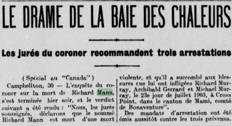 Le corps de Richard Mann, un riche marchand de bois, a été retrouvé en juillet 1903 sur la grève de la Baie des Chaleurs, près de New Carlisle. Il a été battu à coups de pieds et de poings. Selon des témoins, il s’agirait d’une dispute qui a mal tourné. Trois hommes ont été accusés dans cette affaire: Richard Murray, Michael Murray et Archibald Gerrard. En avril 1904, ils ont tous été acquittés. Le meurtre de Mann est donc demeuré non résolu.