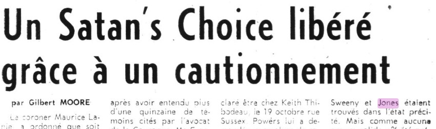 La plupart des témoins qui ont été appelés à se rendre devant le coroner étaient membres du club de motards les Satan’s Choice. Un certain Danny McCain se serait rendu à l’appartement d’une certaine Kate Thibodeau pour demander à récupérer un revolver de calibre .25. Lorsqu’on lui avait demandé s’il avait des problèmes, il a répondu que non, mais que Sweeney et un autre gars en auraient bientôt. « They have to go », a-t-il ajouté. Le lendemain matin, on retrouvait les corps de Sweeney et Jones.
