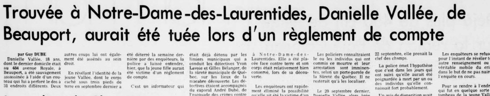 En février 1977, on a retrouvé le corps de Danielle Vallée sous trois pieds de terre. On l’avait enterré dans un champ à 2 000 pieds de la rue des Érables, à Notre-Dame-des Laurentides. On l’avait placé face contre terre. Son corps était relativement bien conservé.